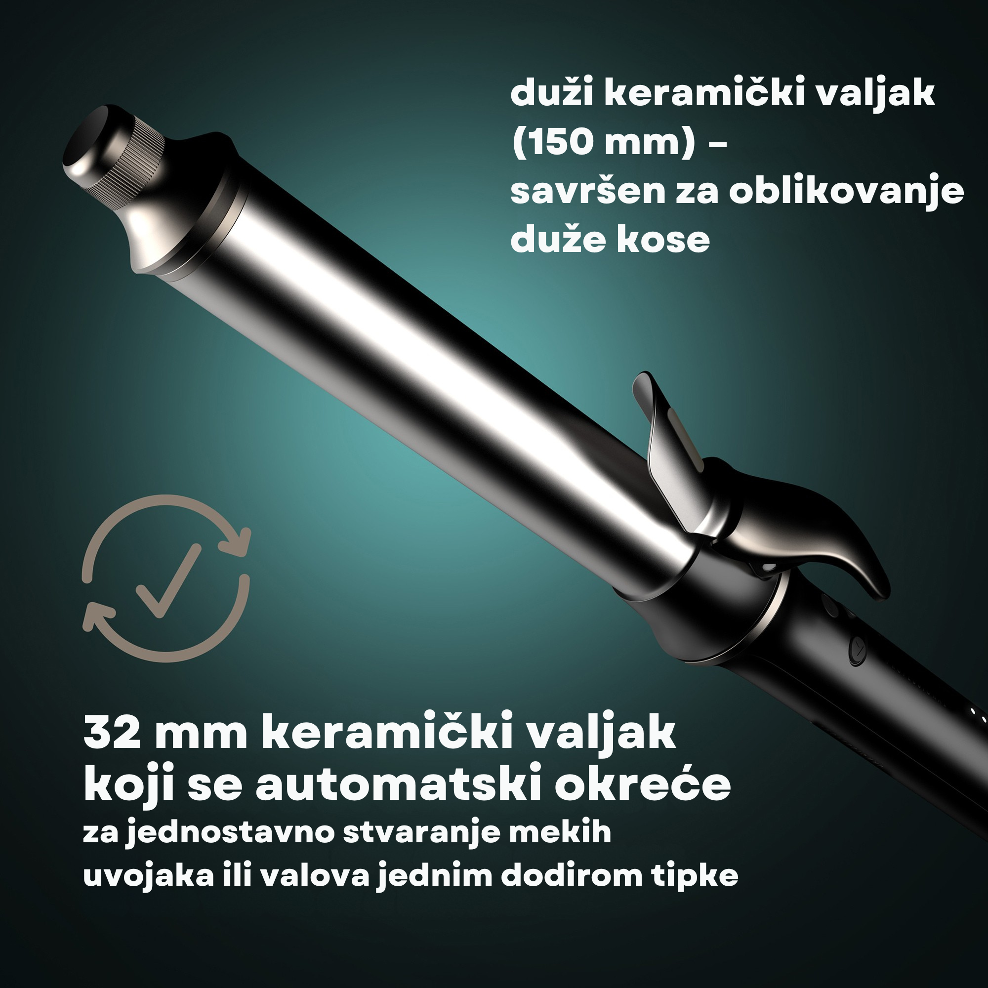 - Produženi keramički valjak (150 mm) za bolje prekrivanje kod uvijanja svih duljina kose